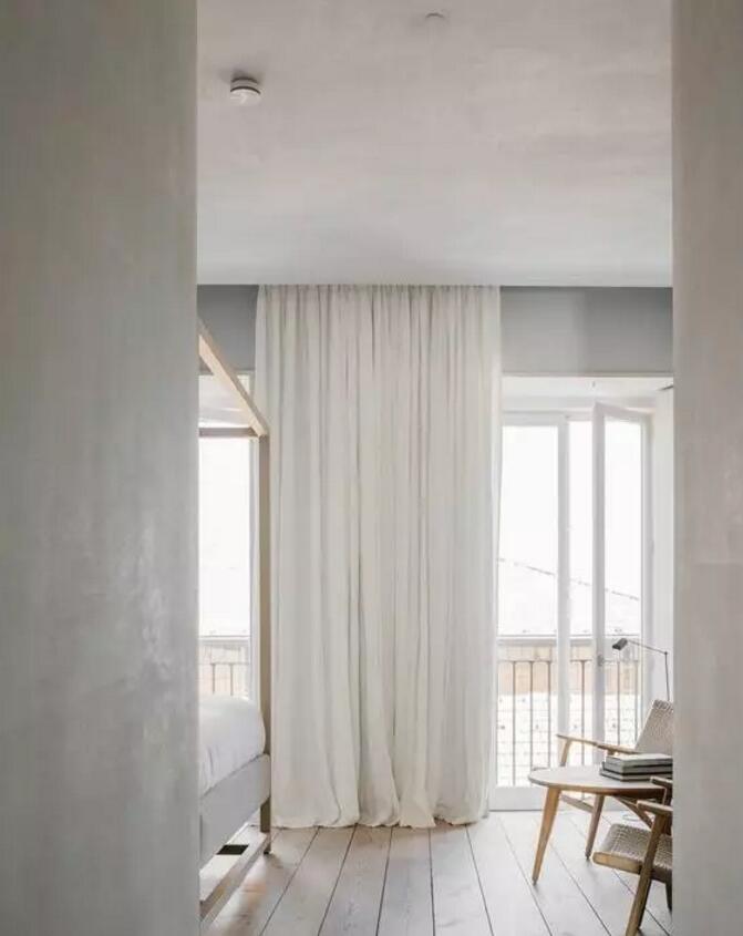金屬桿搭配絲質或紗質的裝飾布,用在臥室中,有剛柔反差強烈的對比美。