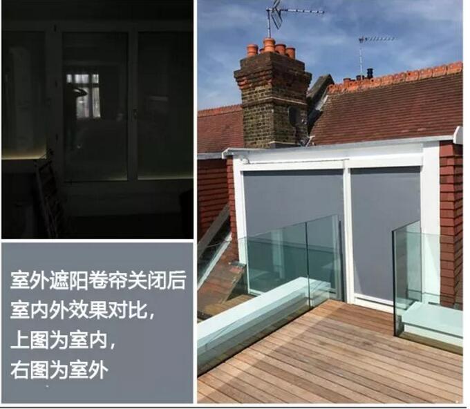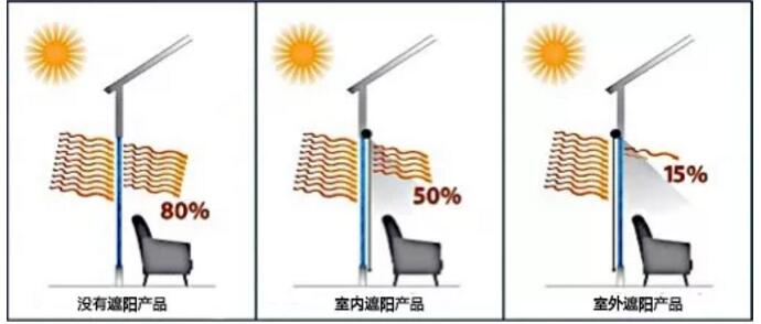 據研究表明,防止太陽熱量進入室內的最有效方法是使用室外遮陽,而卷簾是室外遮陽的極佳方案,下圖可以看出不同產品的遮陽效果對比。