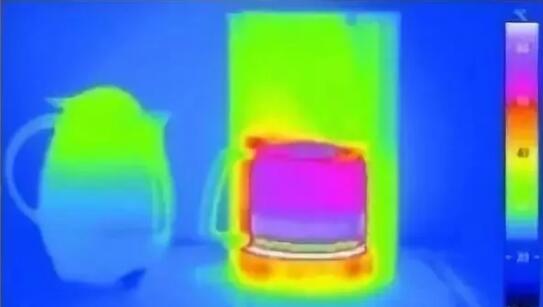 左側的壺表面顏色較淺,表示表面溫度較低,散發出的熱量少,基本依靠被動收集的熱量來保溫,是“被動式的”;